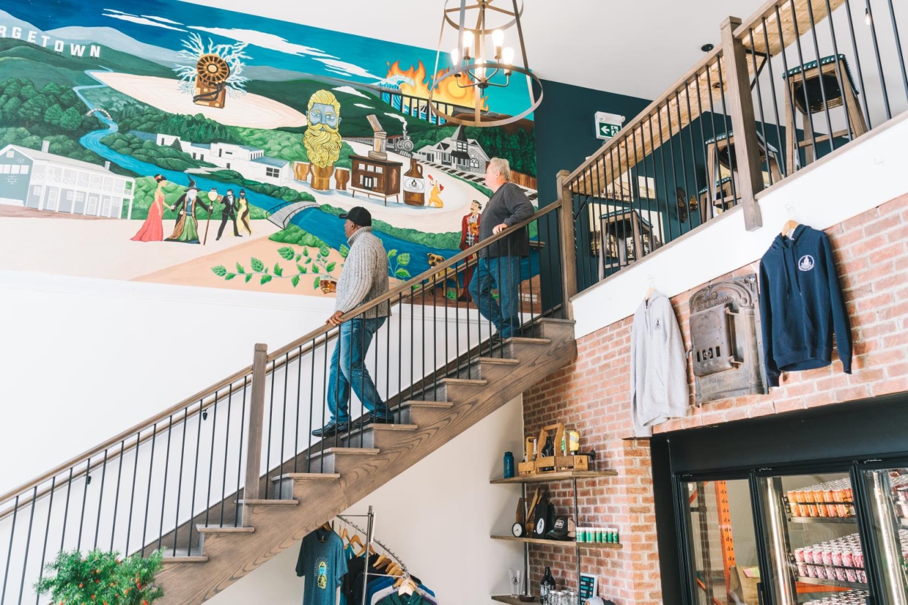 The upstairs taproom at Furnace Room Brewery has become a beloved gathering spot for locals to socialize and enjoy a pint. The design brief called for a rustic yet tasteful space rich in character. Key features included a 60-foot wall mural showcasing iconic beer brand characters, antique Spanish sconces, and a custom driftwood light fixture. A rustic mirror replaced an oversized TV to reflect light and enhance the space, while historic canvas prints celebrated Georgetown's heritage.