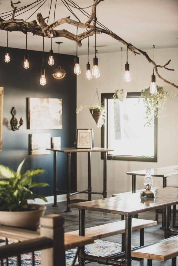 Cozy corners featured leather armchairs, a retro fireplace, and vintage art, inviting relaxation, while a vintage record player encouraged nostalgia. Indoor plants added a natural touch, and a rustic wooden bar offered additional seating. Unique details, like a wall-mounted vintage bicycle honoring the community’s ‘Chicken Man,’ and floating art of Georgetown's Barber Mill, created visual interest.