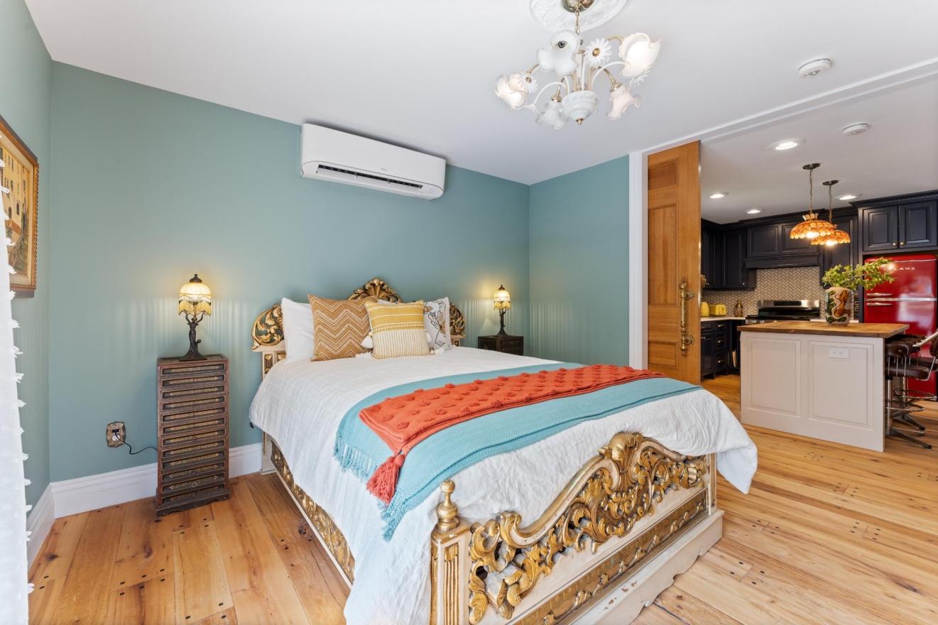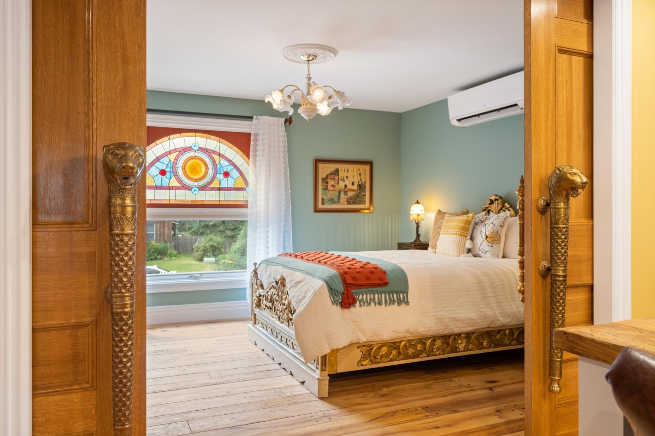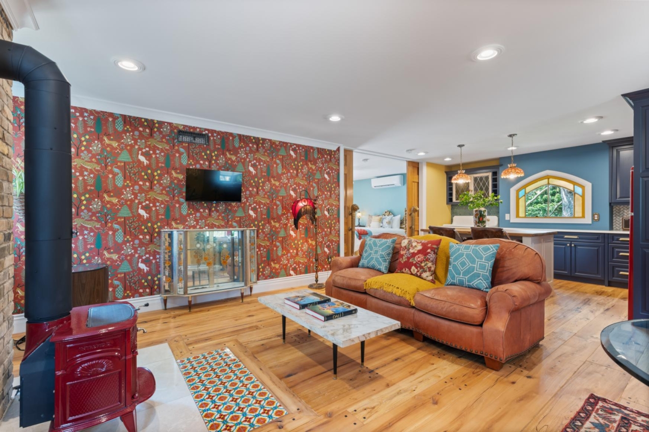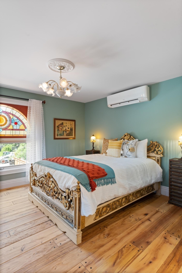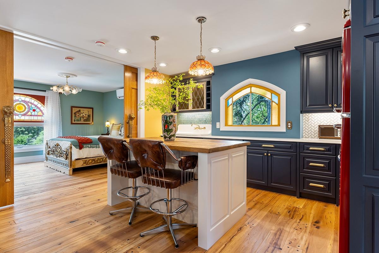 Nestled in a lush garden oasis, this Victorian-inspired Carriage House exudes eclectic charm. It features rustic wooden floors, antique chandeliers, stained glass windows, majestic pocket doors, a wood-burning stove, a clawfoot tub, and a fully equipped kitchen.