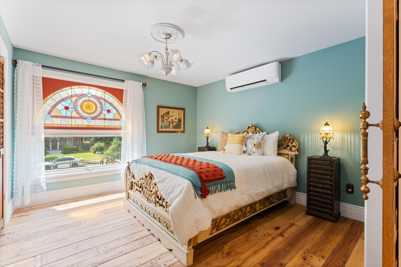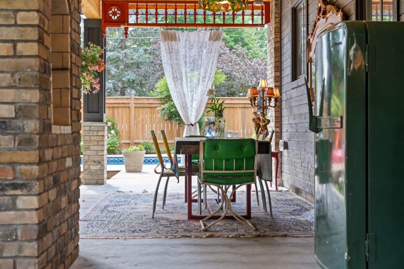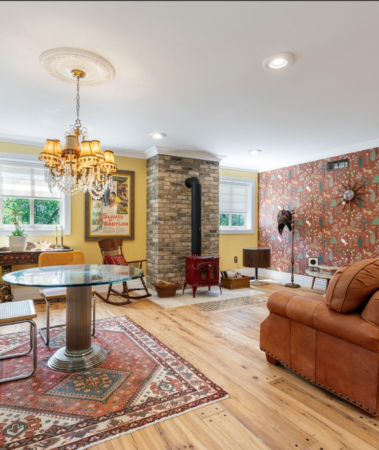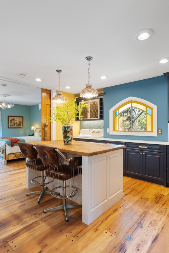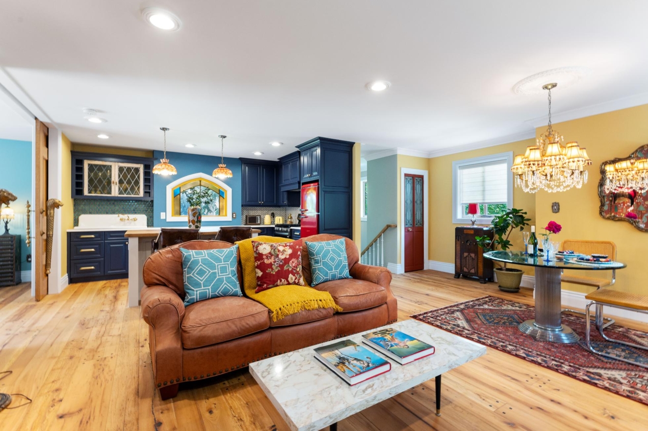 Nestled in a lush garden oasis, this Victorian-inspired Carriage House exudes eclectic charm. It features rustic wooden floors, antique chandeliers, stained glass windows, majestic pocket doors, a wood-burning stove, a clawfoot tub, and a fully equipped kitchen.