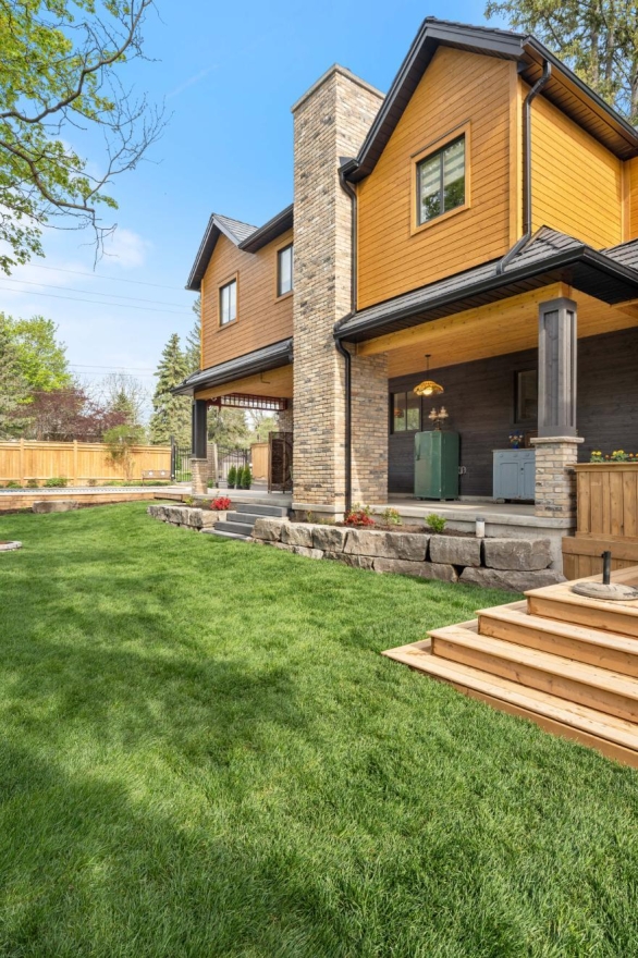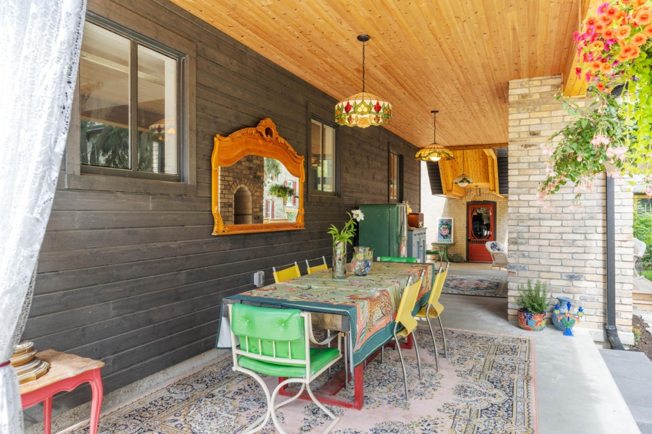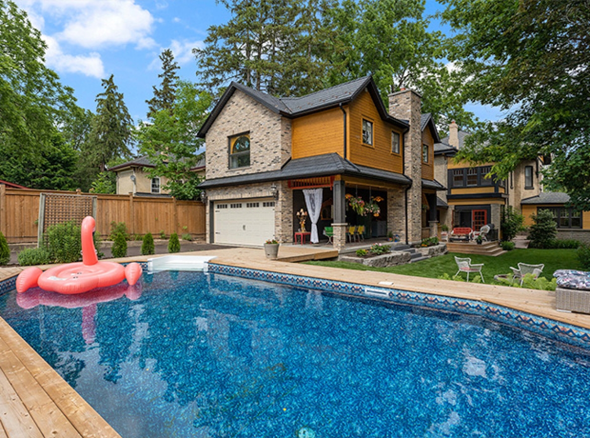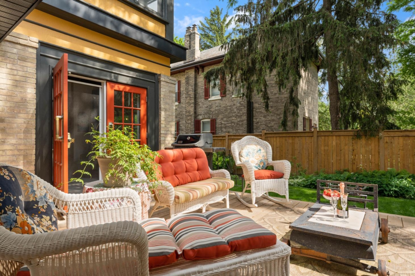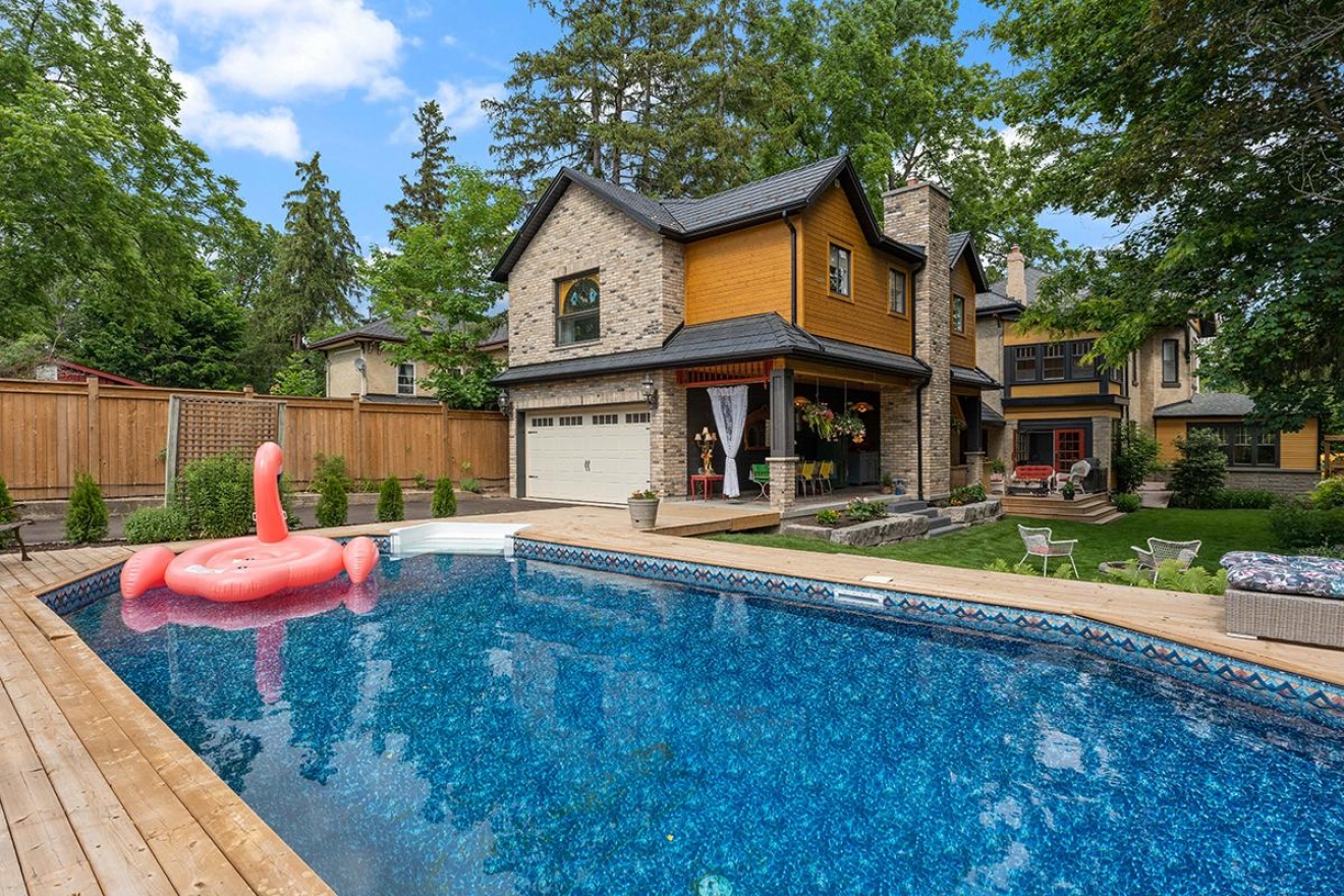 The covered veranda, overlooking a courtyard garden and sparkling pool, offers a perfect space for relaxed summer evenings or tranquil morning coffee.
