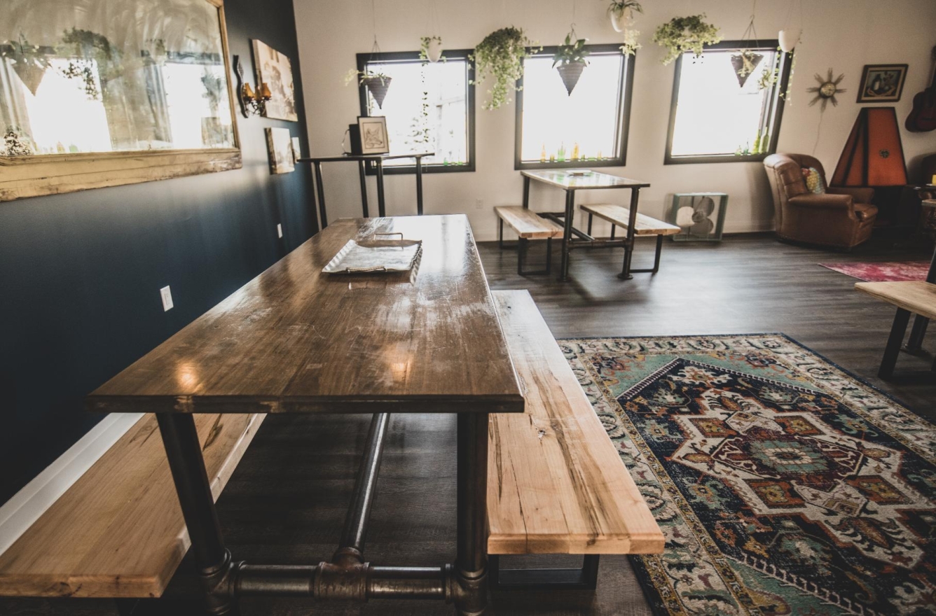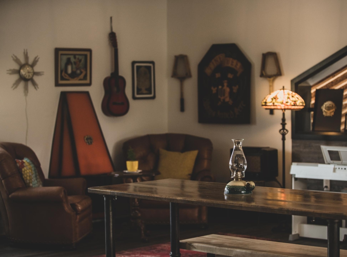 Cozy corners featured leather armchairs, a retro fireplace, and vintage art, inviting relaxation, while a vintage record player encouraged nostalgia. Indoor plants added a natural touch, and a rustic wooden bar offered additional seating. Unique details, like a wall-mounted vintage bicycle honoring the community’s ‘Chicken Man,’ and floating art of Georgetown's Barber Mill, created visual interest.